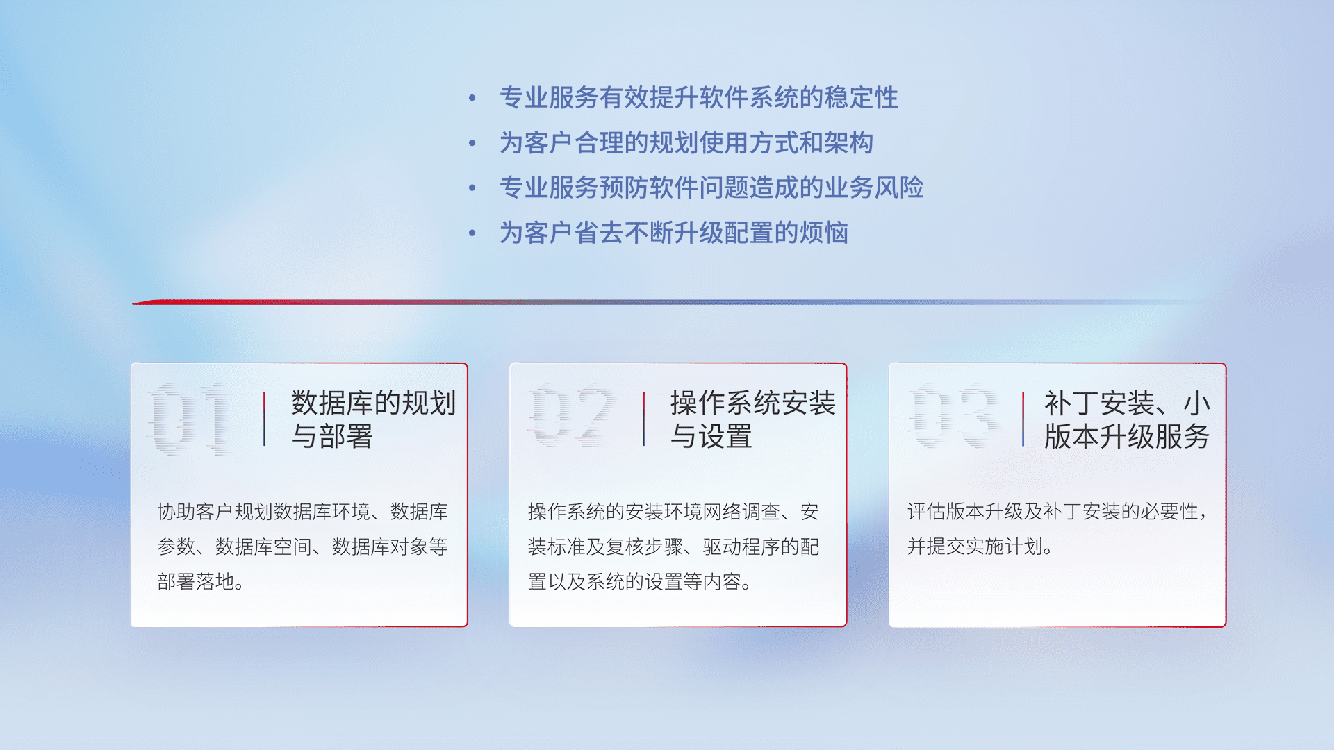 为客户提供软件规模升级、、快速部署、、、、按需配置的专业服务,,,从数据库的规划与部署到操作系统的安装与设置,,,,再到补丁安装和小版本升级提供支持。。